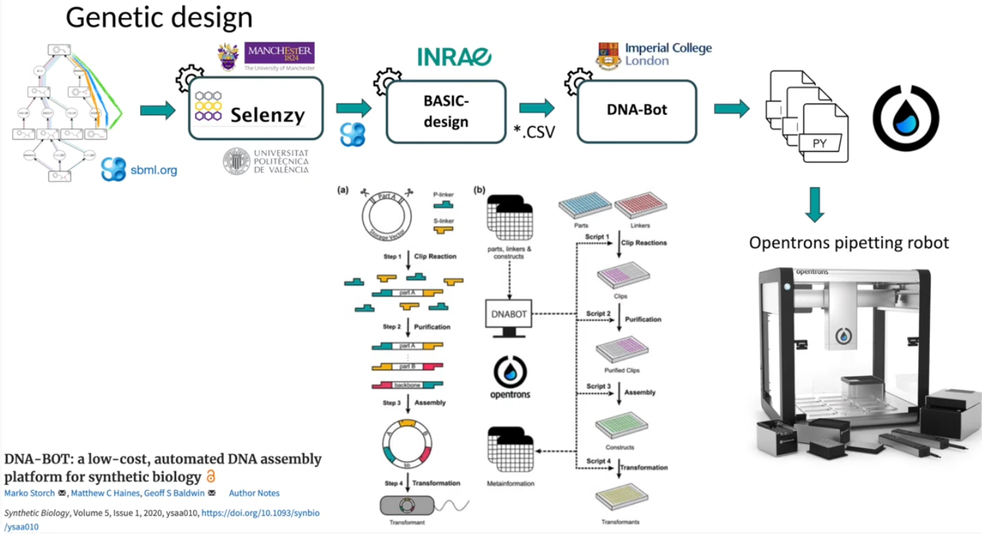 It is a software tool that converts construct design CSV files—such as those produced by rpBASICDesign—into automated assembly protocols for OpenTrons liquid-handling robots. Users may specify labware and protocol parameters (e.g., washing or incubation times). DNA-Bot outputs Python scripts implementing the four BASIC assembly steps: Clip reactions (ligation of DNA parts with linkers), Purification (magnetic-bead cleanup), Assembly (combining purified parts into final constructs), and Transformation (introducing plasmids into the host strain and plating). The tool also produces metadata for tracking experimental parameters.