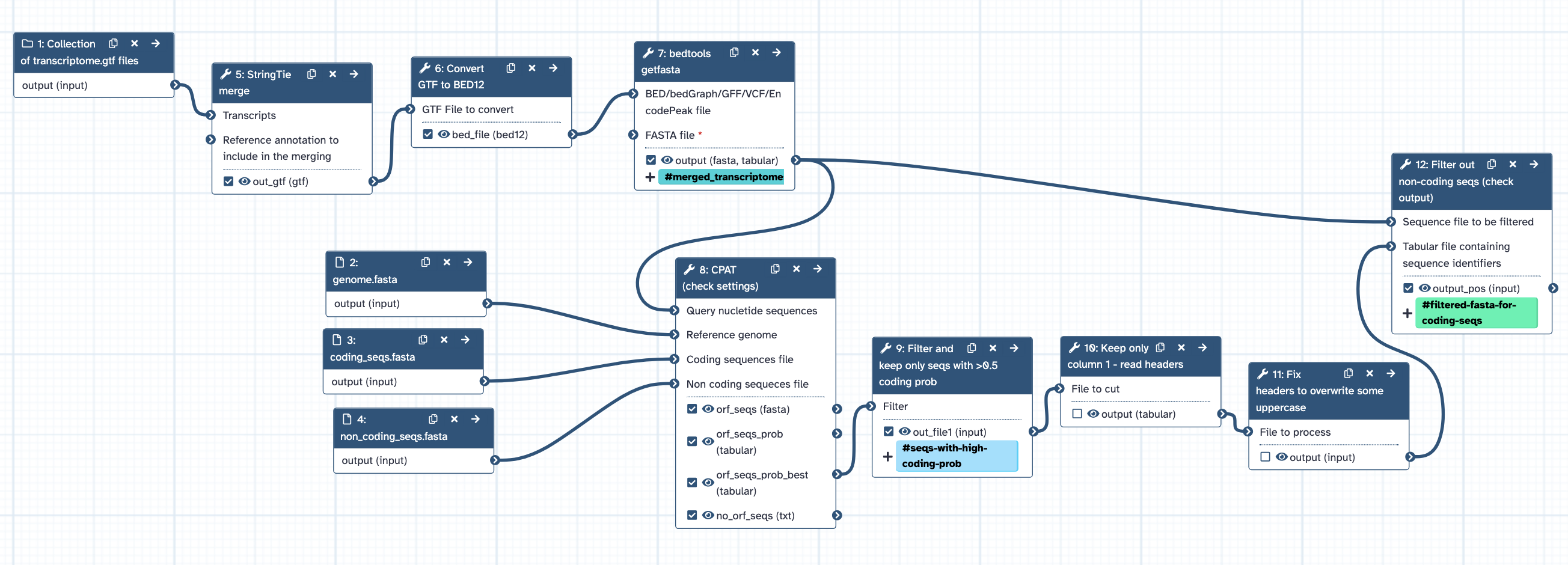 | 7 | CPAT (check settings) | The table of best probabilities is called orf_seqs_prob_best; converted this to tabular toolshed.g2.bx.psu.edu/repos/bgruening/cpat/cpat/3.0.5+galaxy0 |