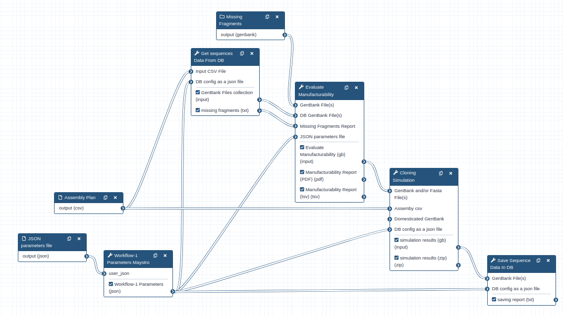 - JSON parameters file (optional) : The JSON file should contain the the parameters used in workflow tools. If this input is not set, user should set the parameters mannualy in the maystro tool.
