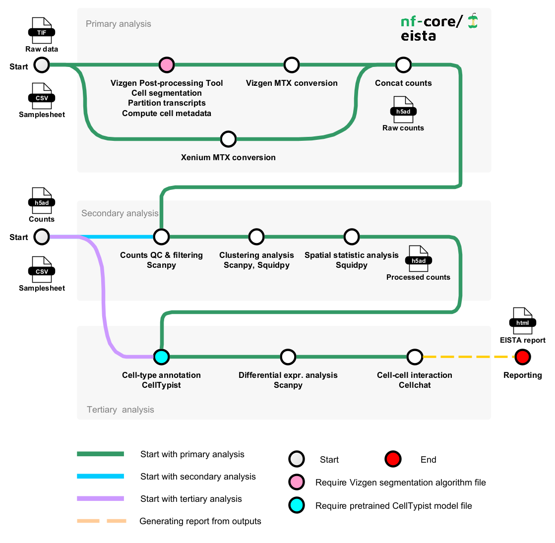 EarlhamInst/eista is a bioinformatics pipeline that performs analysis for single-cell spatial transcriptomics data (Vizgen data and 10x Xenium data). The pipeline is built using Nextflow. The pipeline was developed as a generalized, flexible, and scalable workflow for spatial transcriptomics analysis. It is primarily designed for Vizgen MERFISH data and 10x Xenium data. The pipeline can be applied from multiple starting points, either from raw image data or processed AnnData for the specified analysis phase.
